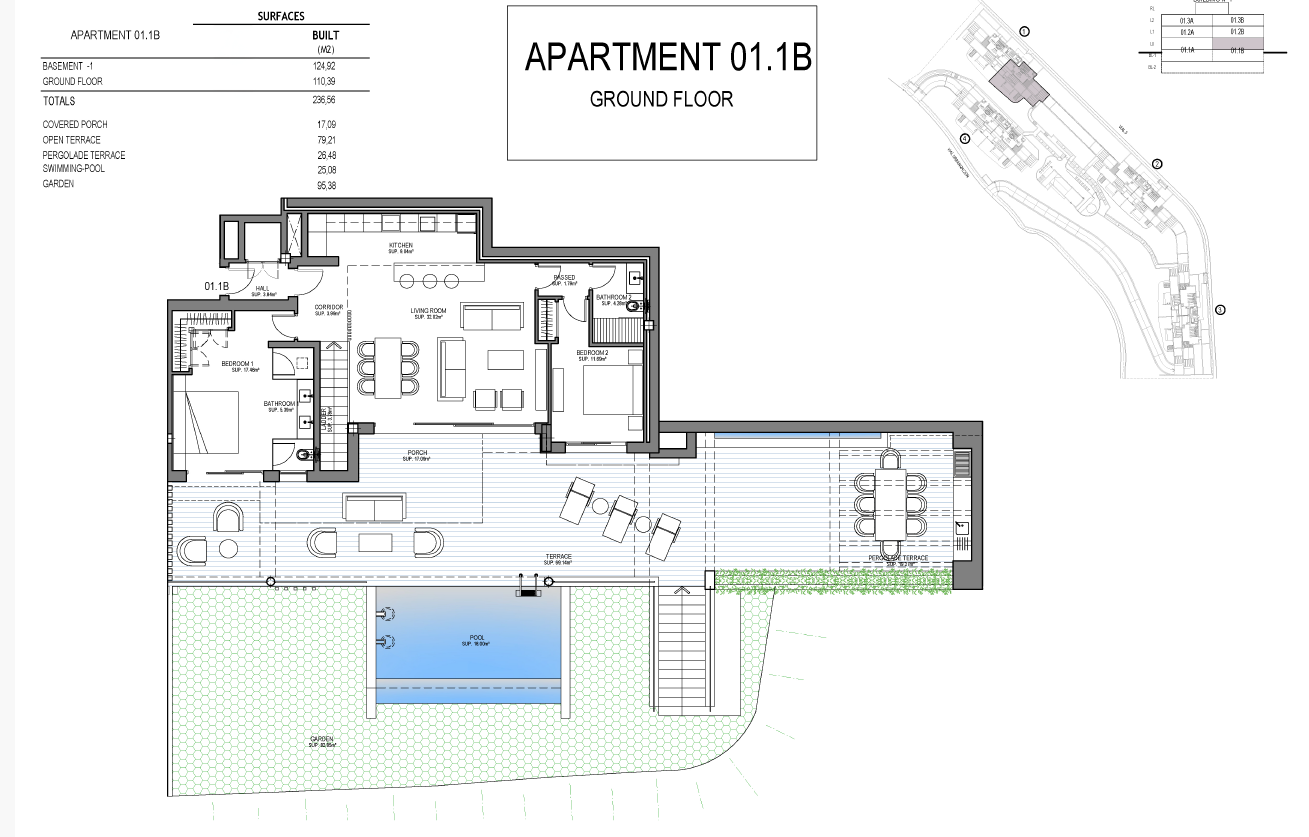 Wskazany w ofercie apartament znajduje się na parterze, łączna powierzchnia użytkowa to 236 mkw, dodatkowo ogród 82 mkw, taras 122 mkw, basen 18 mkw.